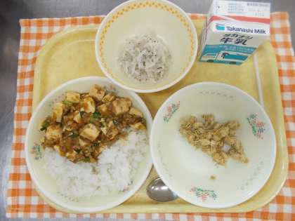 6月2日(水) 公開日 2021/06/02 更新日 2021/06/02 給食 牛乳、麻婆豆腐丼、ゆかり大根、カリカリごまがらめ ※ 大根は、町田で収穫されたものを使って作りました。大根の旬は冬でしたが、品種改良が進み、夏にも収穫できるようになりました。冬よりも辛味が強いです。ゆかりとあえましたが、きょうは、そんなに辛くなかったです。