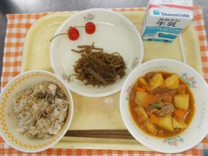 牛乳、かみかみ玄米ごはん、トマト肉じゃが、きんぴら、くだもの