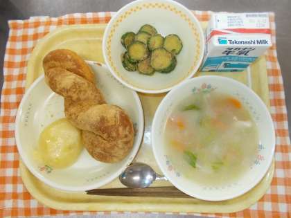 牛乳、きなこ揚げパン、じゃがバター、きゅうりのごま風味、レタスとトマトのスープ