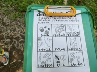 担任の先生と一緒に園内を回って、見つけた物に丸をつけていきます。 この後は範囲を決めて自由に探検します。