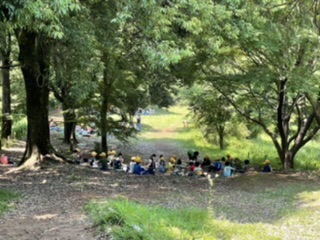 1年 遠足 その11 公開日 2021/06/10 更新日 2021/06/10 学校生活 広がって並んでいただきますをします。 楽しい時間です。 お話しながら食べることは出来ませんが、鳥の声を聞きながら載、 お弁当です。