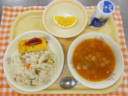 発酵乳、アスパラピラフ、スパニッシュオムレツ、ミネストローネ、くだもの