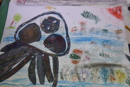 前回の続きで絵にボンドで線を描いてそれにコンテを削って色をつけていく作業をしていました。