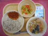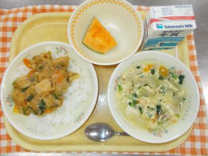 6月15日(火) 公開日 2021/06/15 更新日 2021/06/15 給食 牛乳、ダッカルビ丼、豆腐と冬瓜のスープ、くだもの ※ ダッカルビは韓国の料理で、鶏肉と野菜を炒めたものです。甘辛いコチュジャンが味のポイントです。冬瓜は冬の瓜と書きますが、夏が旬の野菜です。給食ではスープに入れました。果物はメロンです。メロンも今が旬です。