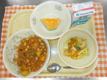 6月18日(金) 公開日 2021/06/18 更新日 2021/06/18 給食 牛乳、パセリライス、チリビーンズ、野菜炒め、くだもの(メロン) ※ チリビーンズは、スパイスをきかせ、蒸し暑い日でも食べやすいようにしました。チリパウダーというスパイスを使っています。野菜炒めは、キャベツをたっぷり使ってシャキッと炒めました。町田で作られたベーコンを使ったので、うまみがしっかり出ています。よく噛んで食べると野菜の甘さも味わえます。