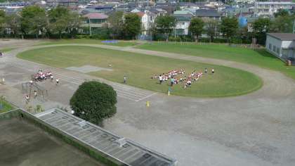 2年生が体育の学習を行っていました。 50m走の記録を取り、その後はフラフープ運動などを行っていました。