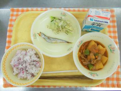 9月13日(月) 公開日 2021/09/13 更新日 2021/09/13 給食 牛乳、ゆかり入り防災ごはん、トマトとオクラの肉じゃが、焼きししゃも、こんぶあえ ※ 防災ごはんに使ったアルファ化米は、長い間保存ができますが、賞味期限が来る前に入れ替える必要があります。混ぜごはんやどんぶり、カレーライスや雑炊などにするとおいしく食べられます。給食では、ゆかりを混ぜ込んで食べやすくしました。いろいろと工夫してアルファ化米のレシピを作ってみるのもいいですね。