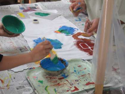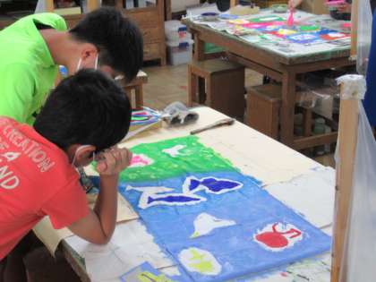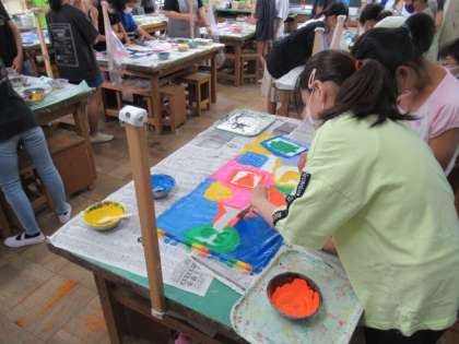 今日は5年生がフラッグアート制作をしていました。きれいな色を使って楽しいフラッグが完成していきます。
