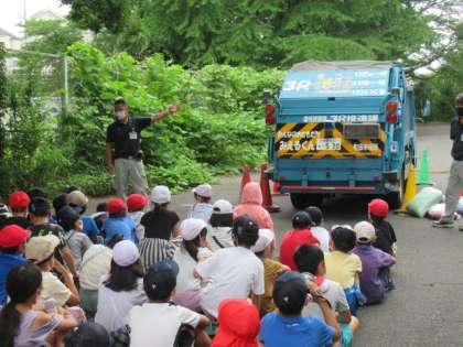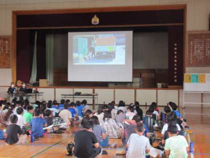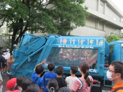 出前授業のため、清掃局の方がゲストティーチャーとして来てくれました。スケルトンのゴミ収集車に子どもたちは興味津々でした。