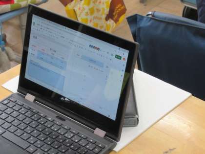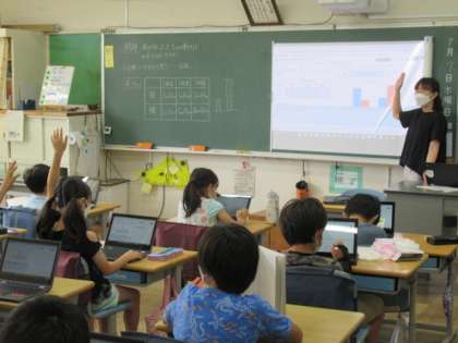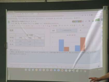 実験で調べた風の力について学習をまとめています。パソコンを使ってデータを活用していました。