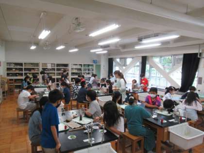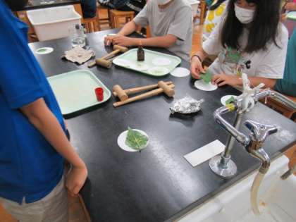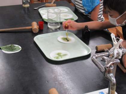 陽に当てた葉と陽に当てない葉とで、でんぷんのでき方を比べます。丁寧に葉をつぶし、試薬をたらしてじっくりと反応を観察しました。