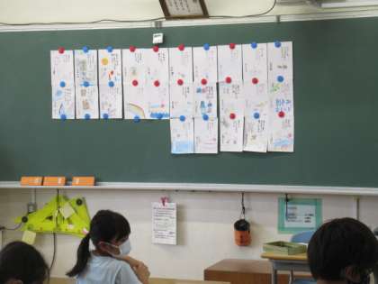 7/8 3年生 夏の俳句 公開日 2022/07/08 更新日 2022/07/08 学校生活 夏休みも近づいてきました。3年生が夏の俳句を作っていました。イラストも入りとても涼しげな作品が並びました。
