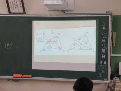 7/12 5年生 多角形の角 公開日 2022/07/12 更新日 2022/07/12 学校生活 「四角形の内角の和は…。」覚えることではなく、「なぜそうなるのか」を考えることが大切です。集中して取り組んでいました。