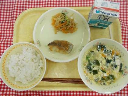 牛乳、麦ごはん、魚のごま味噌ソースかけ、こんにゃくと野菜の甘酢和え、かきたま汁