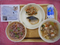 牛乳、えらんで蒸しパン、スープスパゲティ、わさびドレッシングサラダ、くだもの(みかん)