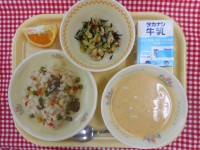 牛乳、もち麦ごはん、豚漬け、和風サラダ、けんちん汁、ゆずはちみつゼリー