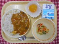 ※ きなこ揚げパンは、給食委員会のリクエスト献立です。おすすめポイントは、「もちもちで甘くておいしいのがポイントです。ツイストした形が楽しいですね」とのことです。組み合わせたのは豚汁です。豚汁は、豚肉や豆腐などと、たっぷりの野菜が入っていて、栄養バランスがよい汁物です。栄養のグループ分けでいうと、赤の食べ物の豚肉・豆腐、黄色の食べ物のじゃがいも・こんにゃく、緑の食べ物のごぼう・にんじん・だいこん・小松菜・ねぎが入っています。
