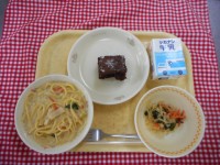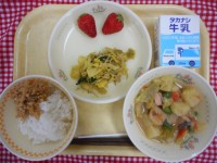 ※ 「エスカベジェ」とは、スペイン料理で、食品を保存のために酢に付け込んだものです。きょうは、魚のたらを焼いて、酢を使ったソースをかけました。トマトシチューは、トマトたっぷりのシチューです。小麦粉を香ばしく炒めて、ルーを作りとろみをつけました。くだものはりんごです。クエン酸やリンゴ酸という成分が、胃腸の働きを良くし、殺菌作用などの効果を発揮します。旬の食べ物を楽しんでもらえたらと思います。