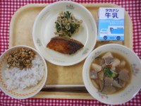 牛乳,ごはん, 油あげのふりかけ, じゃがいものそぼろ煮,焼きししゃも, ごまあえ