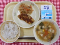 給食では海藻がよく出ます。おうちでも使いやすくて食べやすいのは、わかめでしょうか。カットわかめをみそ汁に入れると簡単ですね。ほかにも、ひじき、こんぶ、もずく、青のり、のりなどが、海藻の仲間です。海藻はエネルギーが少ないですが、ミネラルと食物せんいが豊富です。便秘や下痢にならないよう便通をよくし、腸の働きがよくなると免疫力(病気を予防する力)がつくなど、体の調子をととのえます。おうちの方と一緒に、ぜひ作ってみてくださいね。