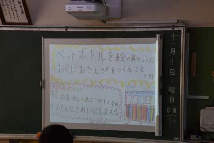 この班は絵の具置き場の奥にペットボトルを置いておくと絵の具が取りやすくなると発表していました。