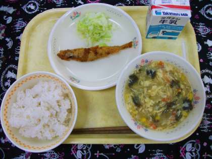 11月11日(水) 公開日 2020/11/11 更新日 2020/11/11 給食 牛乳、麦ごはん、ししゃもフライ、ボイルキャベツ、かきたまコーンスープ ※ ししゃもは頭からしっぽまで丸ごと食べられます。苦手な人も骨まで全部食べてくれると嬉しいです。キャベツと交互に食べるとさっぱりします。