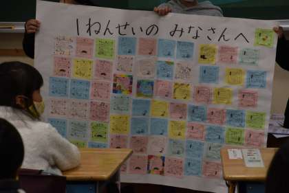 写真は1年生に届けた時の様子です。「やってみようのダンスは元気が出ました」「やってみようで連続縄跳びができていて凄いなと思いました」などの感想が書かれています。