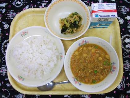 11月12日(木) 公開日 2020/11/12 更新日 2020/11/12 給食 牛乳、麦ごはん、ひよこ豆のドライカレー、わかめと大根のサラダ ※ ひよこ豆は、ガルバンゾーとも呼ばれ、ひよこのような形をした豆です。芋類のように、ほくほくしています。ドライカレーに入れました。サラダは、わかめ、きゅうり、大根のサラダで、しょうゆ味のドレッシングをかけました。