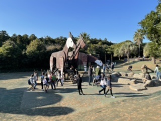 班行動の時間も終了に近くなり、動物を見終わった班の子どもたちは隙間時間に公園で遊んでいます。