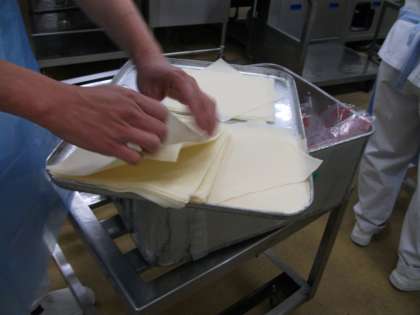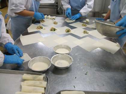 次に、作った具を皮で包みます。4年生が遠足でいませんが、それでも600人分近く作ります。この写真で、具を皮で包んでいる人は何人いるでしょうか。