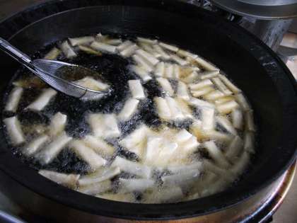 最後に、油で揚げます。薄くてパリパリの皮の食感は、油の温度が下がらないよう、さらに均等に火が通るようにして揚げることで生まれます。