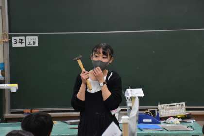 図工の学習 3年 公開日 2020/12/09 更新日 2020/12/09 学校生活 3年生が図工の学習を行っていました。 のこぎりや金づちを使って工作をするようです。金づちの使い方や置き方を学習していました。金づちには叩く面が2つあり、1つは平でもう1つは緩やかな曲面だそうです。