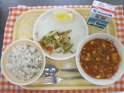 牛乳、パセリライス、ポークビーンズ、茎わかめのサラダ、りんご