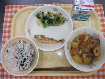 12月10日(木) 公開日 2020/12/10 更新日 2020/12/10 給食 牛乳、わかめごはん、はたはたのから揚げ、野菜のごまあえ、じゃがいものそぼろ煮 ※ はたはたは、雷の神という意味だそうです。東北では、雪が降る前に雷が鳴ることが多く、その時期にちょうど日本にやってくるからだそうです。骨まで丸ごと食べられるようにから揚げにしました。