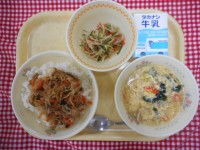 「西湖豆腐」というのは、中国の料理です。西湖という湖があり、景色が美しく、魚がおいしい所だそうです。西湖の豆腐料理という意味で、西湖豆腐と名付けられました。トマトが入ったさっぱり味です。温かく提供したい料理は、4時間目終了時刻の30分ほど前に完成するように計画立てて作っていますが、気温が暑い日が続いているこの時期は食べづらさもあるなと感じました。