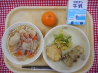 卵焼きに使った塩麹は、米麹、塩、水を混ぜて発酵させた日本の伝統的な調味料です。麹のうま味と塩味が合わさり、料理に深みとコクを与えます。また、糖質をエネルギーに変換し、疲労回復に役立つビタミンB1が豊富です。豚汁にたっぷり入れた豚肉もビタミンB1が多く含まれる食材です。他にもこんにゃくや大根、にんじん。じゃがいも、小松菜などの野菜を入れました。今日は少し気温が下がったこともあり、温かい汁物もよく食べてくれていました。