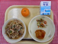 牛乳、秋の煮込みうどん、五平餅、白菜とわかめの甘酢あえ、くだもの(みかん)煮込み...