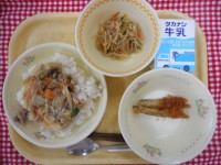 牛乳、中華丼、小魚の南蛮漬け、春雨入りナムル小魚の南蛮漬けには、わかさぎを使いま...