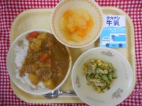 牛乳、チキンカレーライス、元気サラダ、シュワシュワフルーツポンチきょうは人気のカ...