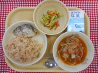 牛乳、麦ご飯、ぶりの塩焼き、野菜の昆布あえ、かき玉汁きょうのお魚はぶりです。ぶり...