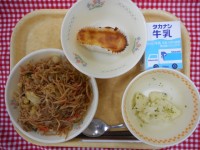 牛乳、麦ご飯、ぶりの塩焼き、野菜の昆布あえ、かき玉汁きょうのお魚はぶりです。ぶり...