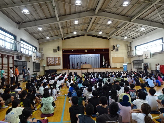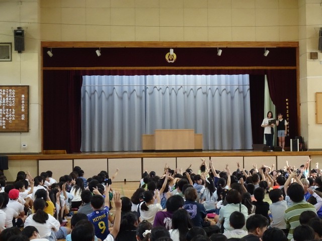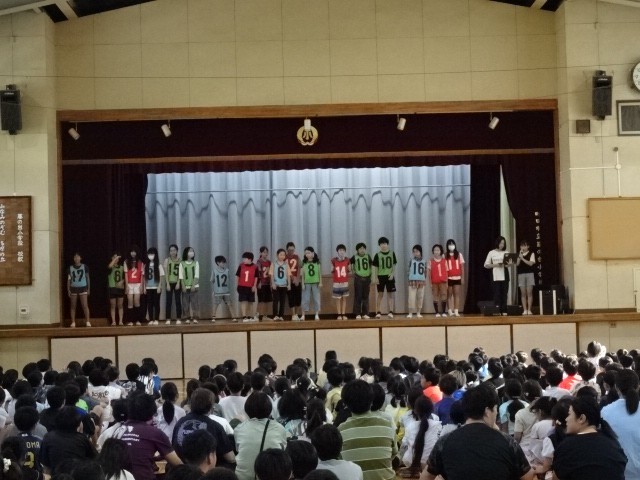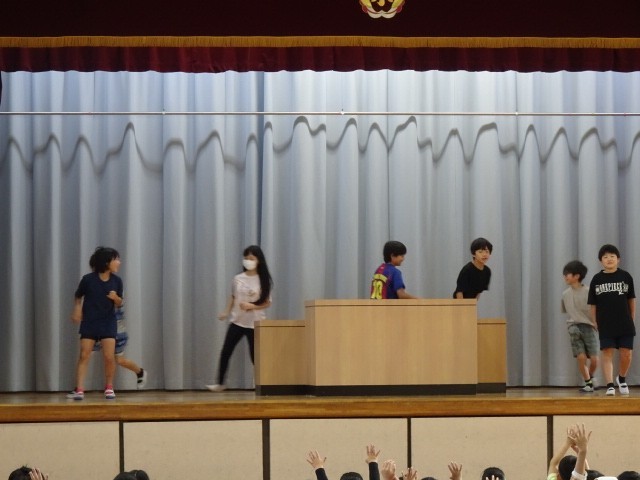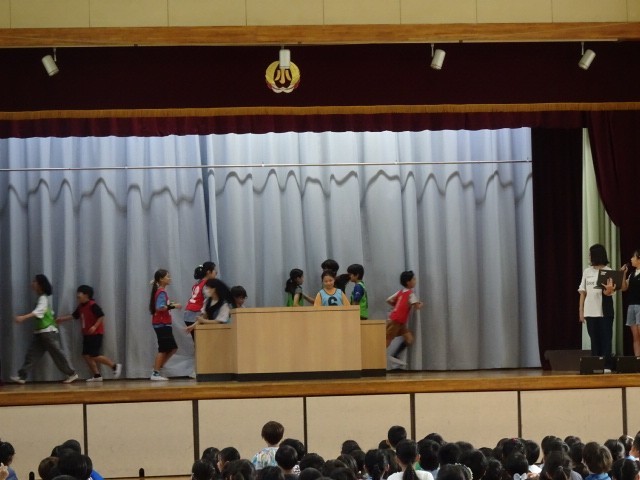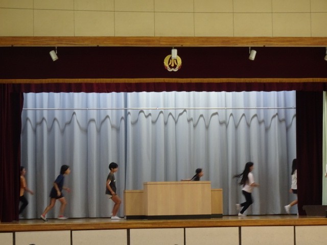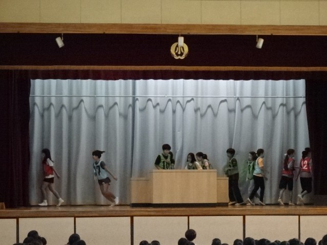 全校児童でゲーム集会をしました。集会委員がステージ上の左右から歩いてきます。箱に見立てた演台の中にしゃがみこんだり、座ると見せかけて通り過ぎたりした後に、「さて箱の中には何人いるでしょう)と問いかけます。
