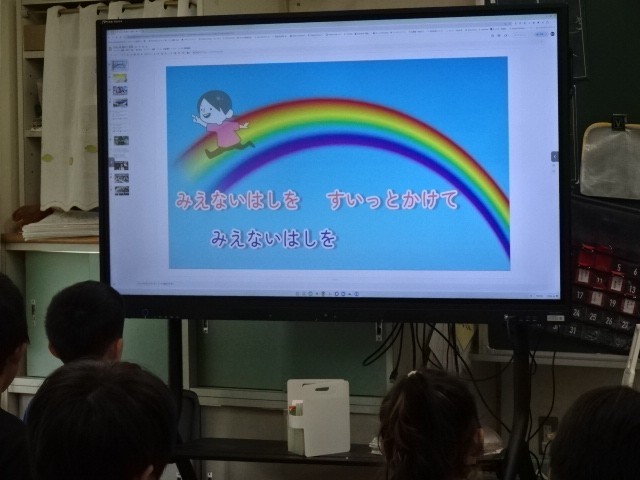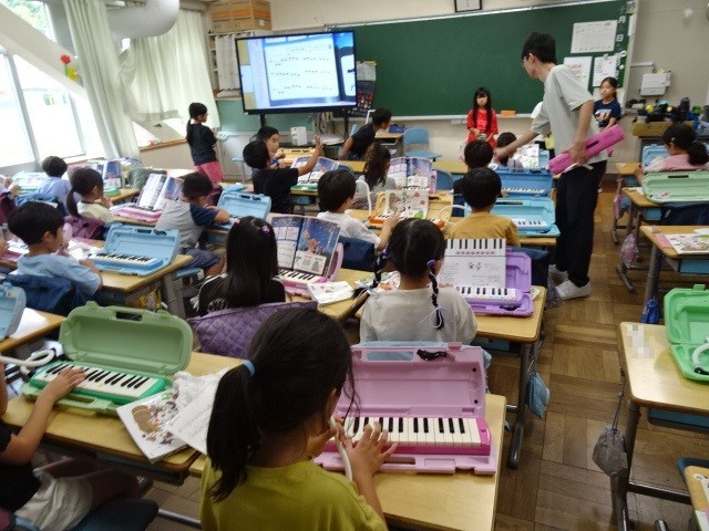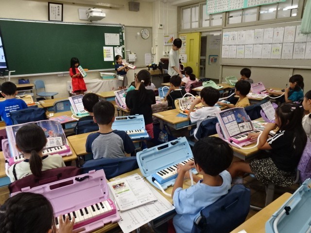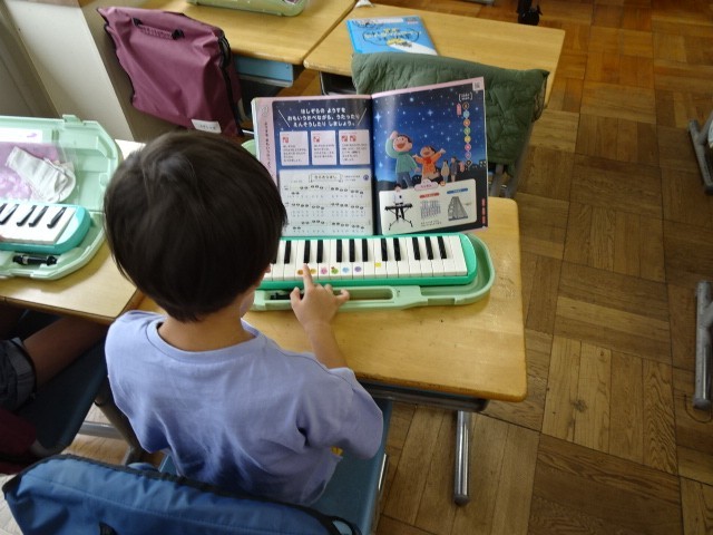 1年生が音楽の学習をしていました。音楽会にむけて全員合唱の「すてきな一歩」をどの部分を盛り上げて歌うのか考えながら歌っていました。その後に「きらきら星」を鍵盤ハーモニカで練習していました。