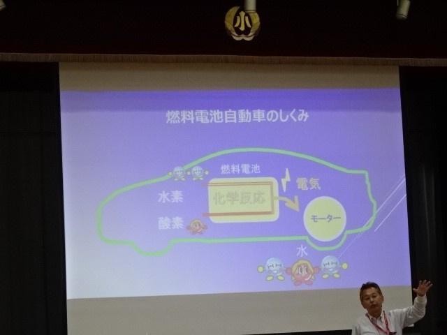 町田市役所環境資源部やトヨタモビリティの方々においでいただき、水素燃料による発電について教えていただきました。この発電にはCO2が発生しません。