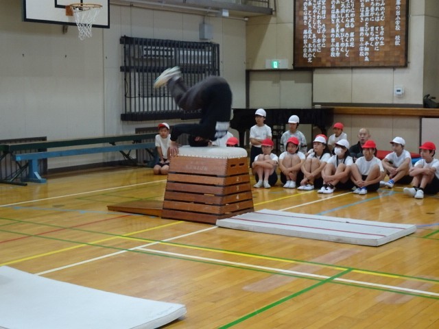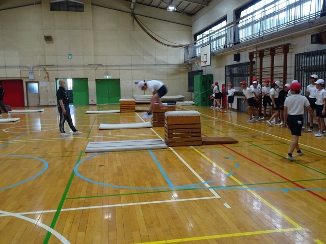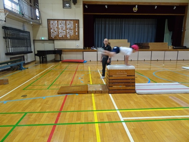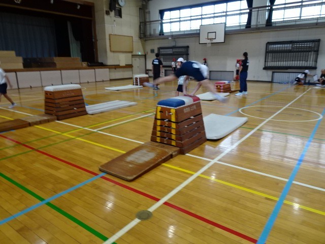 6年生は、調節板を入れて空中姿勢を意識して跳んでいました。「手を着く位置を変えて跳ぶといいよ」などと互いにアドバイスし合いしながら学習していました。
