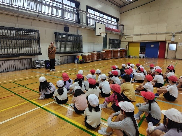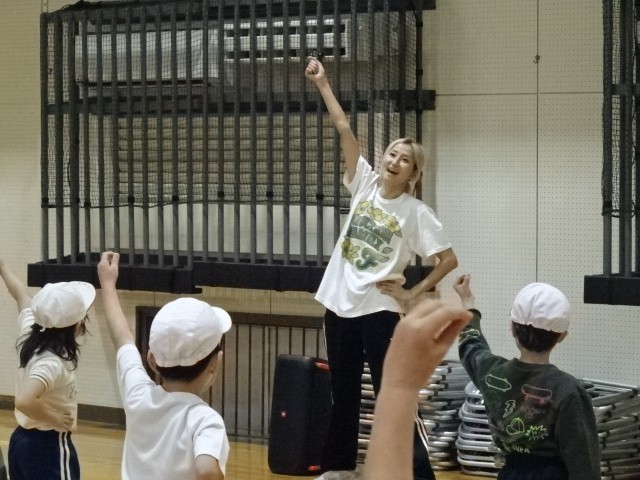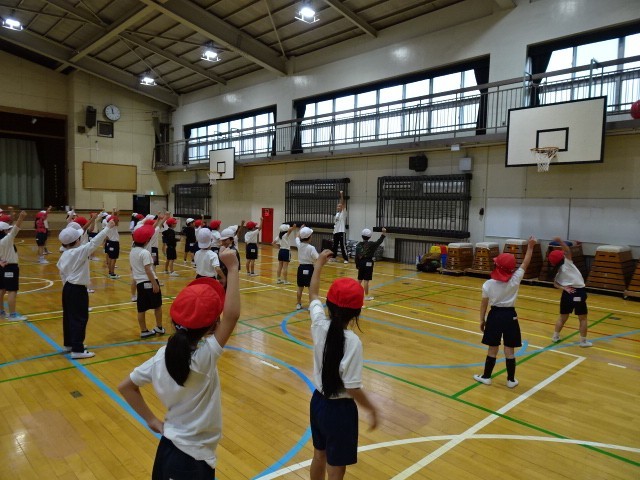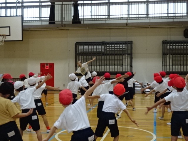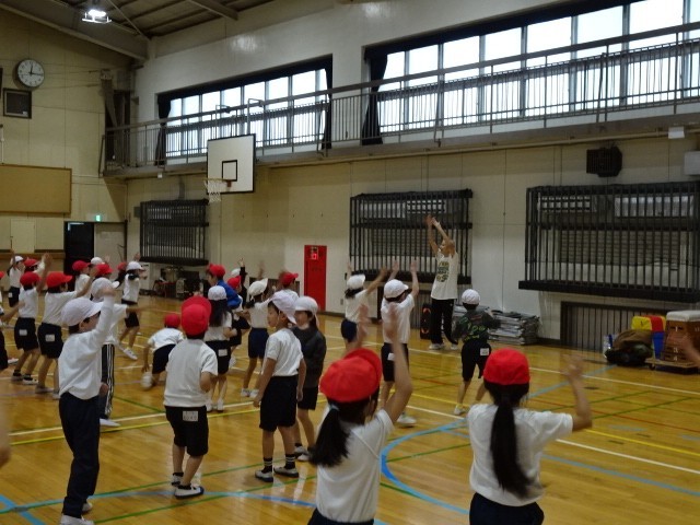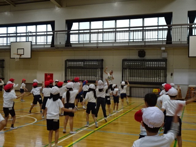 1年生がゲストティーチャーをお招きして、ダンスを学習しました。講師の先生のまねっこをしながら、日常の「いただきます」「いってきます」などの動きをしました。悲しいときは少し小さめに、元気な時は大きく、その他ゆっくり、速くのリズムを意識して踊りました。最後には、子供たちから希望のあった『ライラック』の曲に合わせて踊りました。