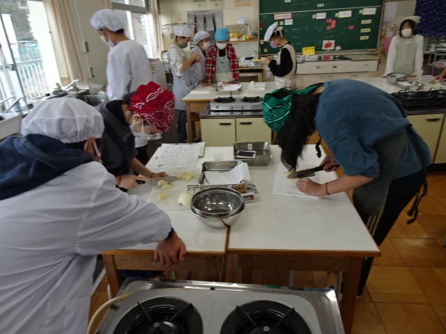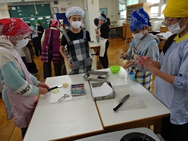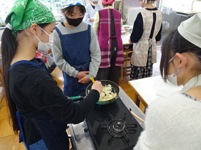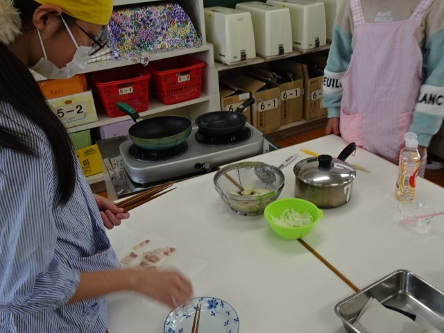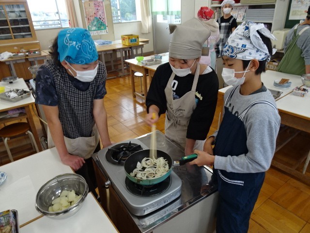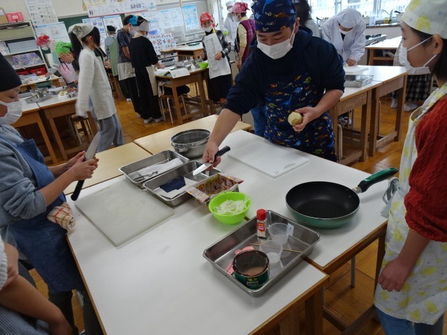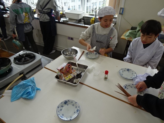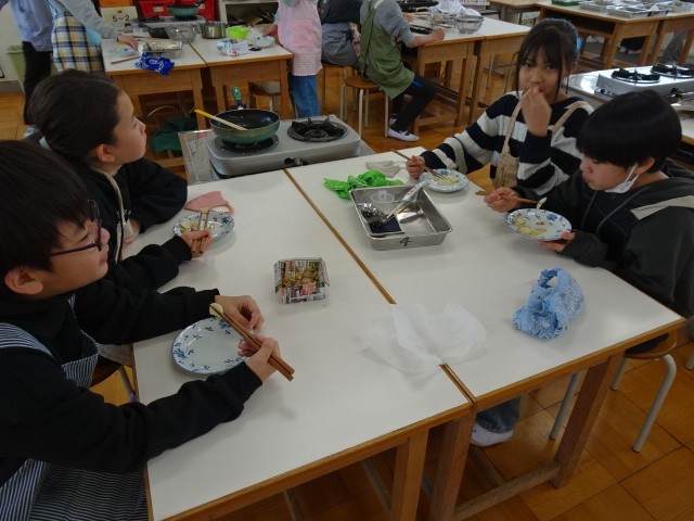 6年生が調理実習でジャーマンポテトを作っていました。ジャガイモを切ってゆでた後、玉ねぎやベーコンと一緒に炒めました。『じゃがいもが少しかたかったかも』『塩味はちょうどいい』『いつもよりは薄味』などと感想を言いながら食べていました。後片付けは、お皿やフライパンの油の汚れを要らなくなった布や紙ナプキンでふき取ってから丁寧に洗っていました。これからの生活にぜひ役立ててほしいです。