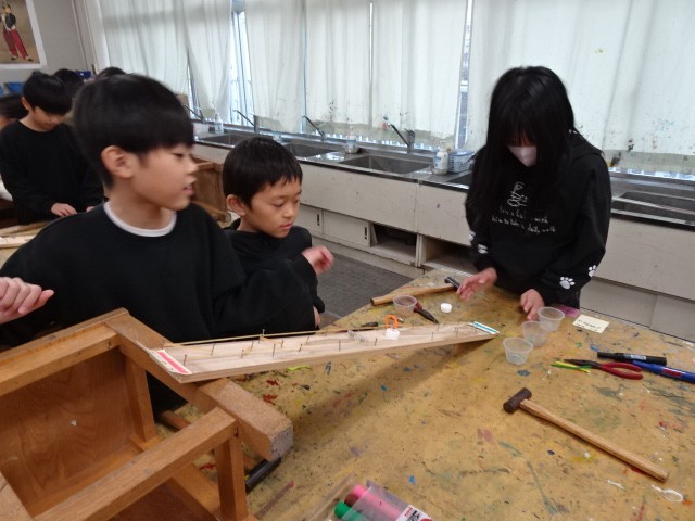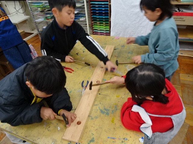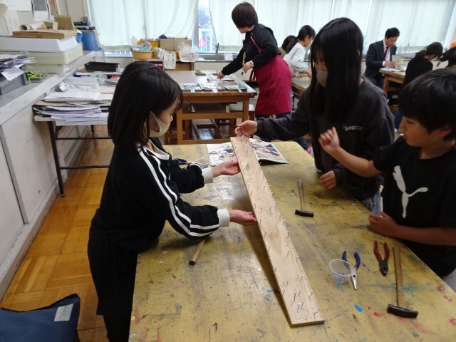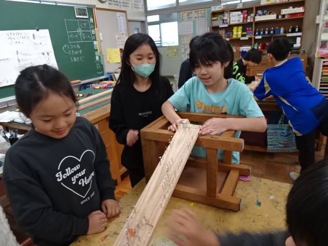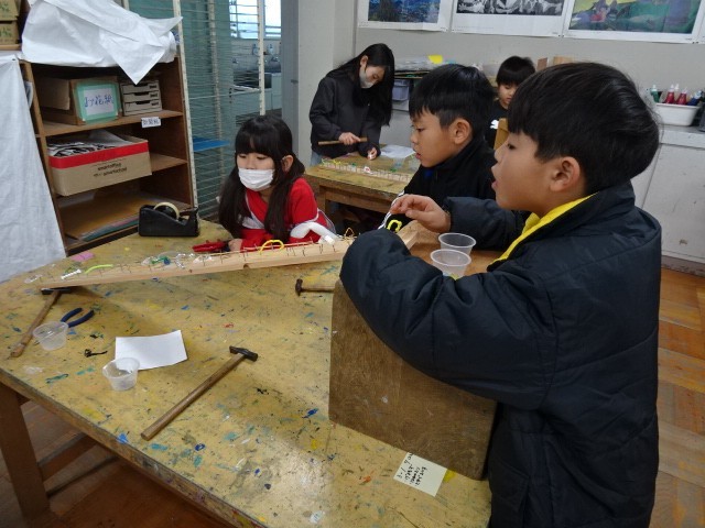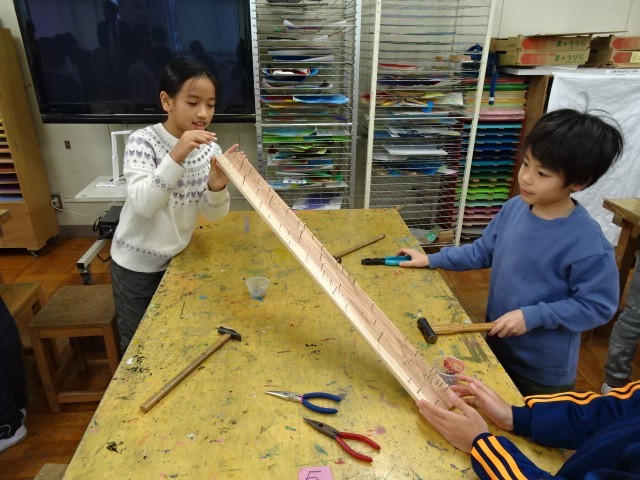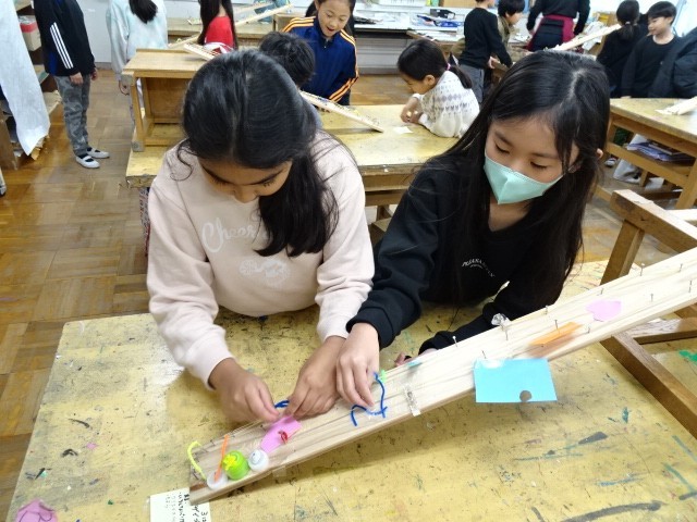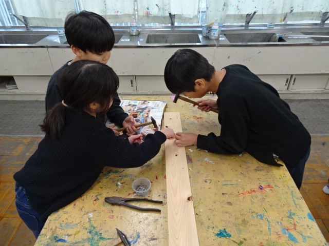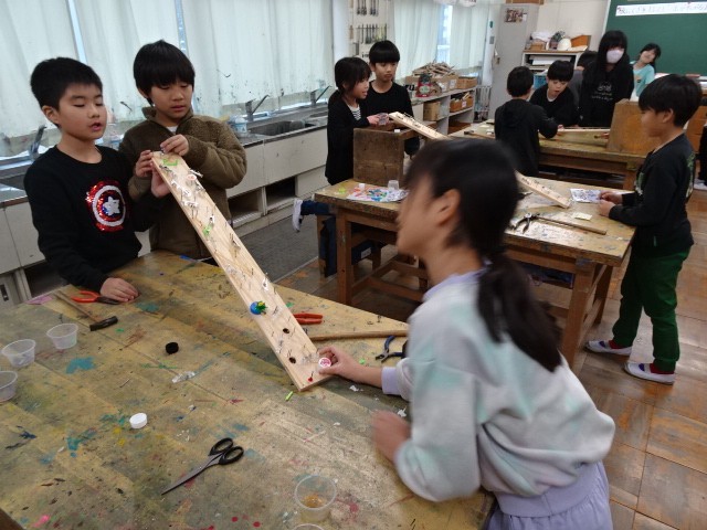 3年生が『トントンくぎ打ちコンコンビー玉』の学習で、初めて金づちで釘を打ったり、ペンチで抜いたりしました。班で板に釘を打ち、坂にしてビー玉を転がします。途中でビー玉がコースアウトしないように位置を考えて釘を打ったり、モールや輪ゴム、ペットボトルのキャップをコースに取り付けて工夫したりしました。最後には板の角度を変えてり、転がすスピードやスタートの位置を変えたりしながら何度も楽しむことができました。