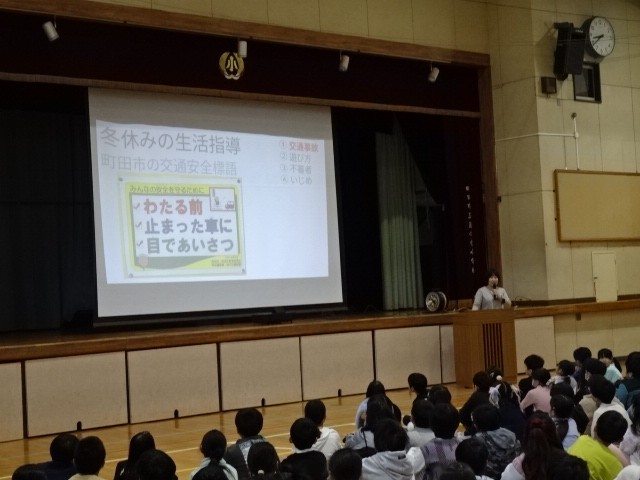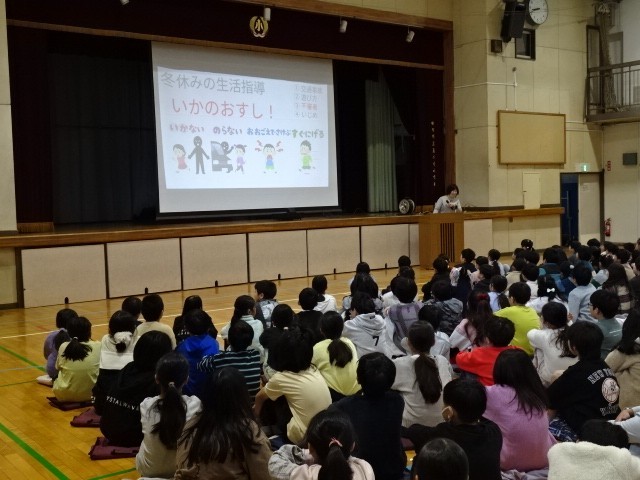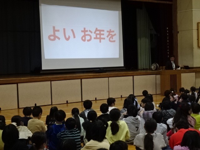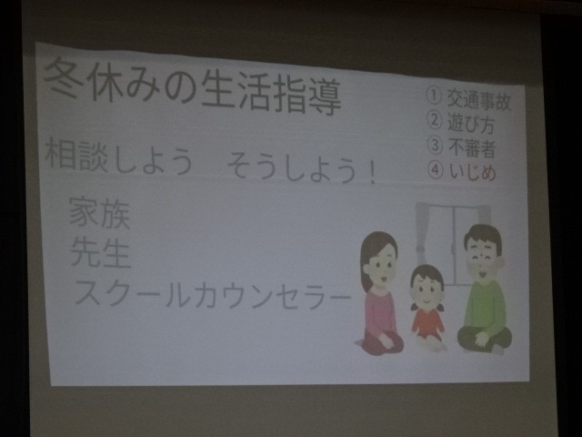 次に生活指導のお話がありました。交通事故、不審者、お金、いじめについてです。楽しい冬休みが本当に楽しくなるように、一人ひとりが思いやりをもって、そして落ち着いた穏やかな日を過ごしてほしいと思います。