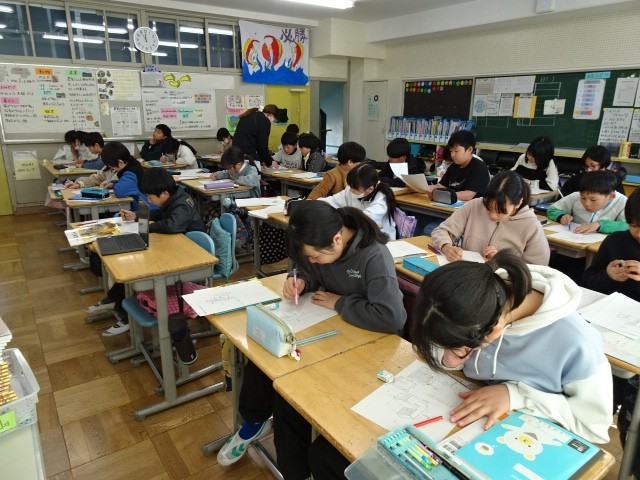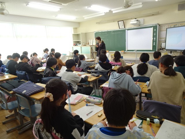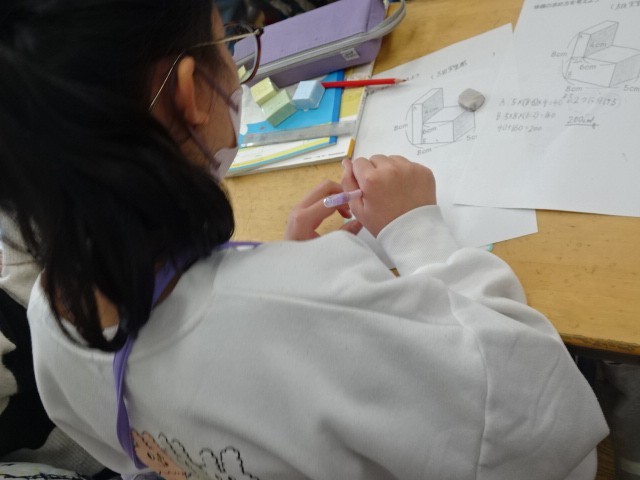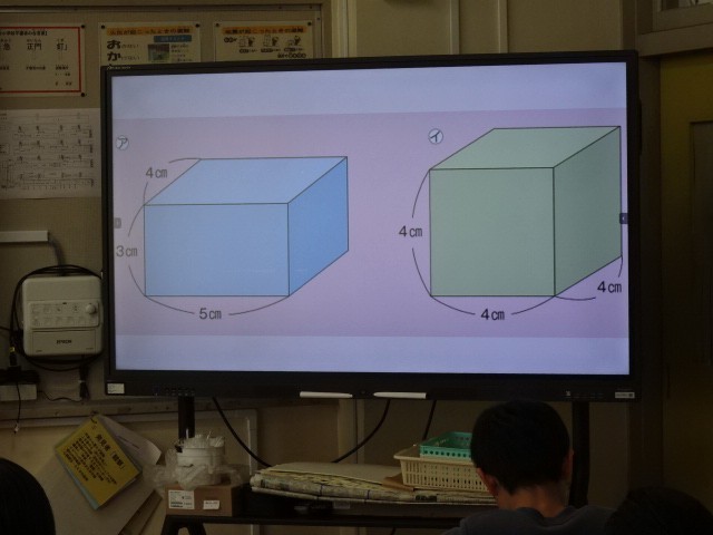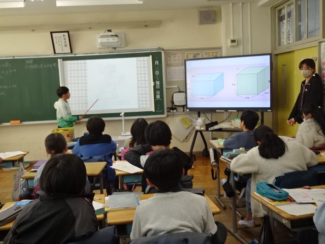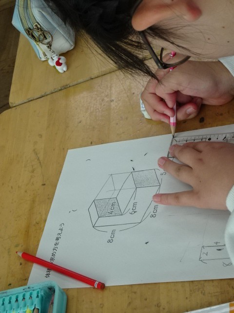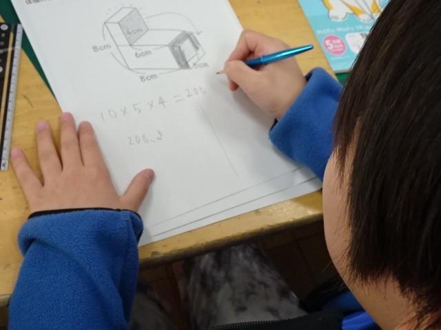5年生が複雑な形の体積を求める学習をしていました。既習の求め方から何か工夫はできないか各自真剣に考えていました。最後に考え方を全体に説明して、自分とは違う考え方を知ることができました。